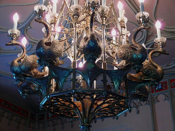 Людвиг очень ценил всякие технические изобретения. Так что в замке была холодная и горячая вода, канализация, электрические звонки для вызова слуг, опускающиеся для зажжения свечей люстры и даже  автоматический мангал-вертушка. Всё это можно увидеть, отстояв двухчасовую очередь и посетив замок. Источник фото.