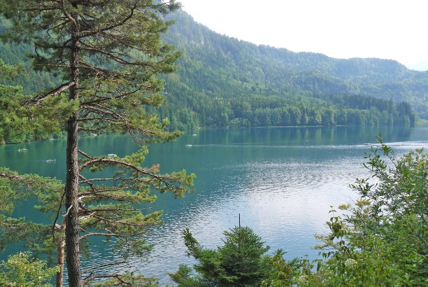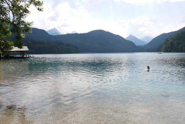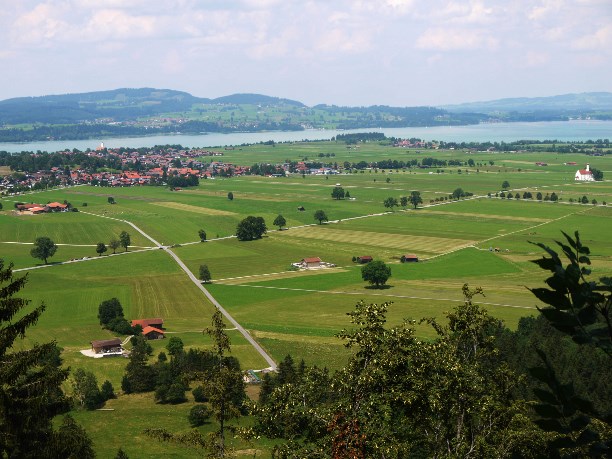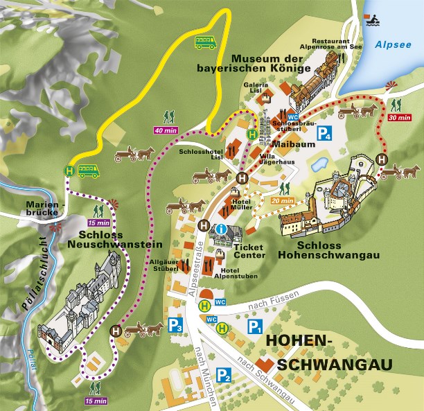 Замок стоит между двух горных озер Альпзее (Альпийское озеро) и Шванзее (Лебединое озеро).