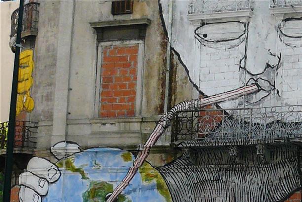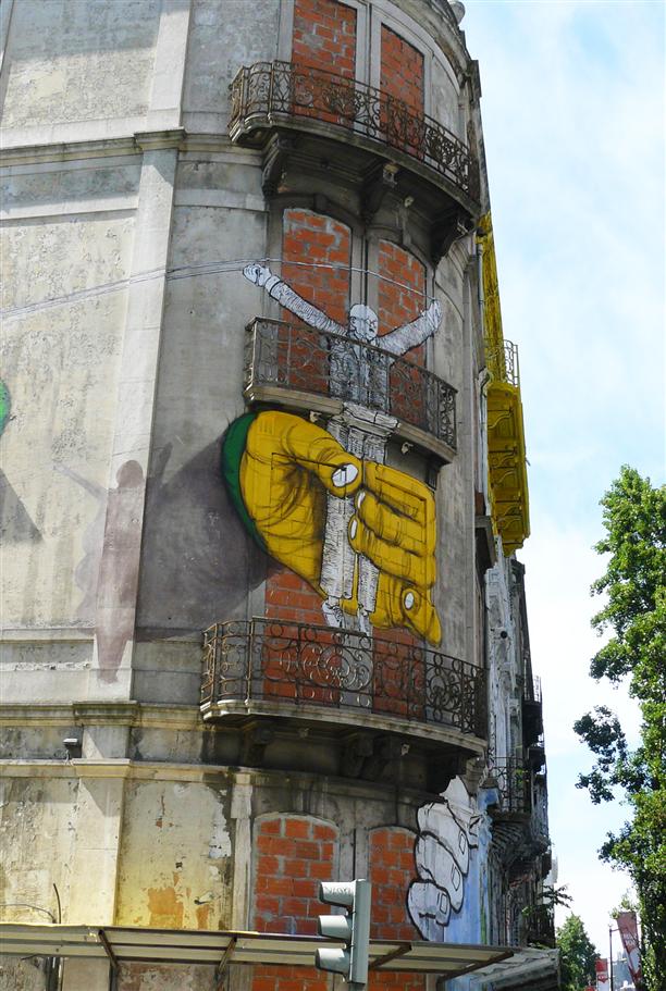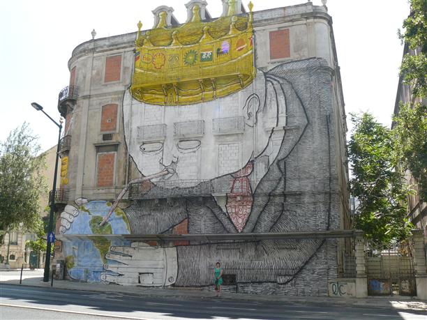 А еще в Лиссабоне впечатлили граффити размером с дом! Причем у королька на фасаде вместо глаз были гири на веревке, свешенной с крыши. Они раскачивались от ветра и было ощущение, что дом следит за прохожими :)))
