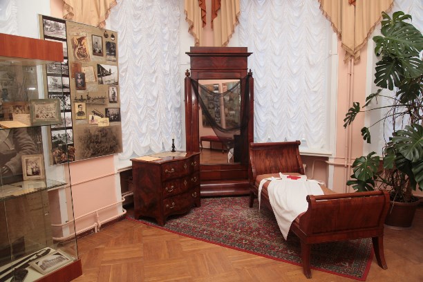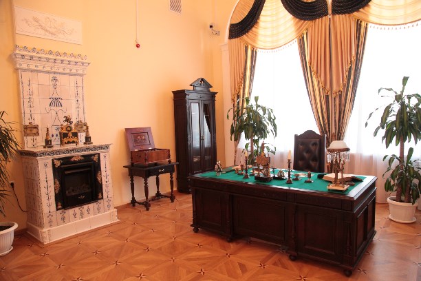 Вторую половину экспозиционного зала занимает импровизированный интерьер кабинета министра. Письменный стол, диван, кресло, книжный шкаф и напольные часы – это копии, выполненные по образцам конца XIX века. Все остальные экспонаты – подлинники 1870-80-х гг. Каминная печь выложена подлинной изразцовой плиткой.