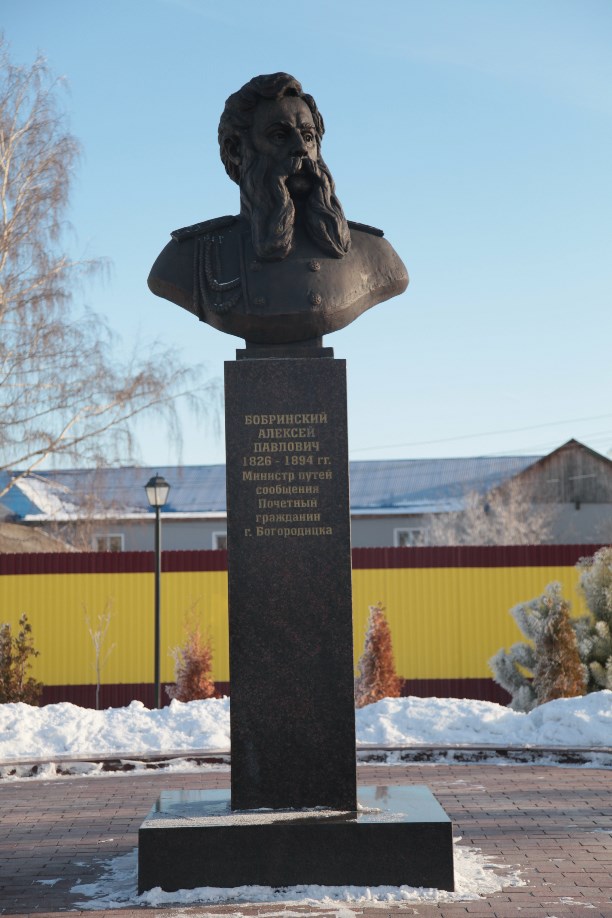 Слева от здания – бюст-памятник почётному гражданину города, третьему министру путей сообщения графу Алексею Бобринскому. Бюст создал скульптор Арнольд Чернопятов, тот же автор, который создал памятник Болотову в Богородицком парке.