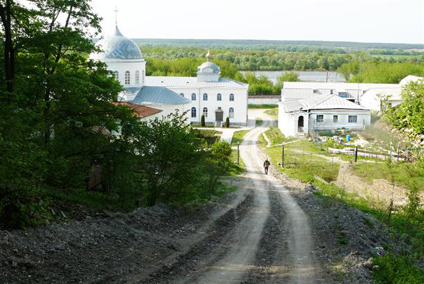 Внизу монастырь, над ним пещерный храм, еще выше золоченный крест, - оттуда такой вид! И даже железная дорога неплохо вписывается :)