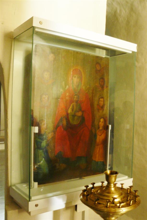 В церкви всего одна икона и та за толстым стеклом. Остальные приносят сюда только во время богослужений. Слишком большая влажность - могут не выжить.
