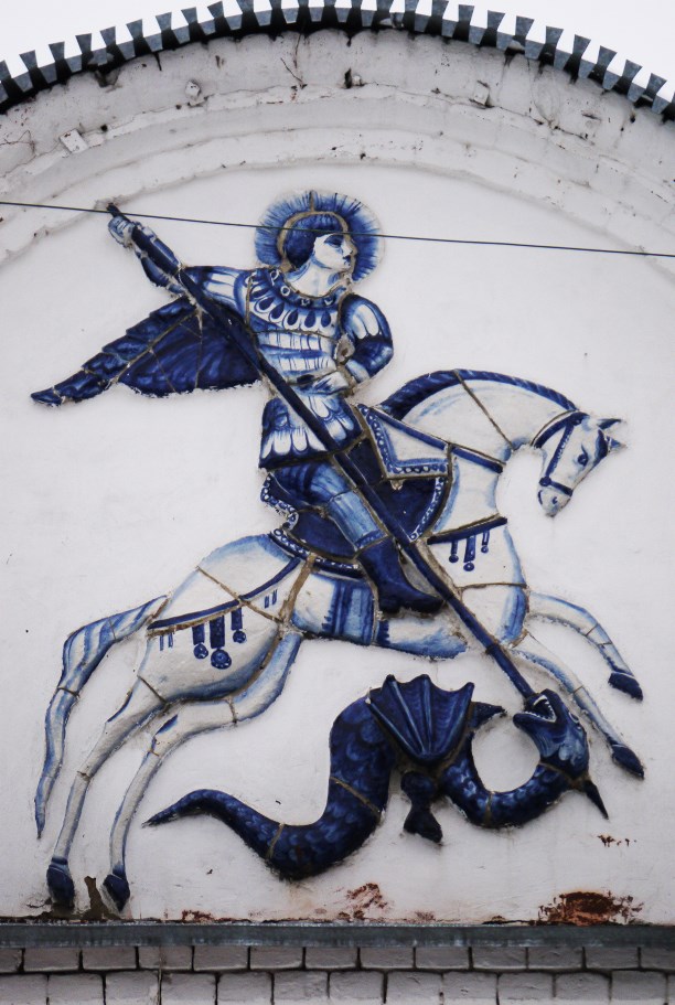 Былое величие выдаёт только герб над входом. Не иначе, как гжель. В тему будет сказать, что город назван в честь Святого Егория, то есть Георгия Победоносца.