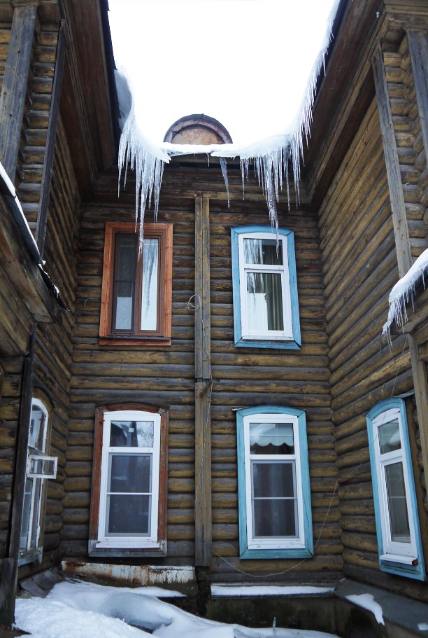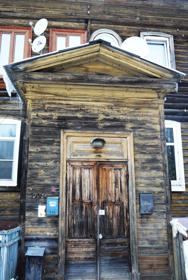 Деревянный, длинный, двухэтажный, с разностильными крылечками. В доме 15 квартир и у каждой свой вход. Со стороны улицы входы только на второй этаж...