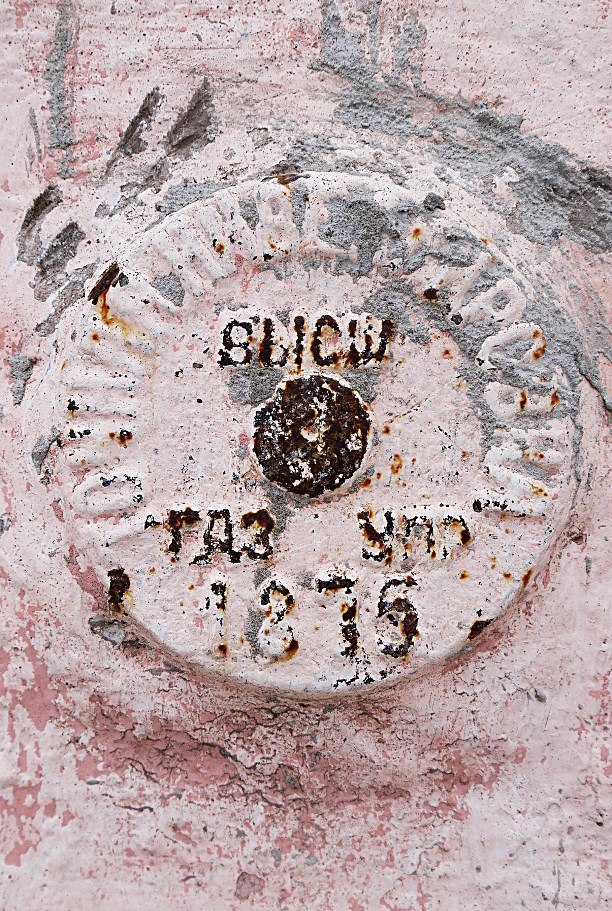 На въездных воротах «печать геодезистов». Причём датируется сей нивелирный знак 1875 годом.