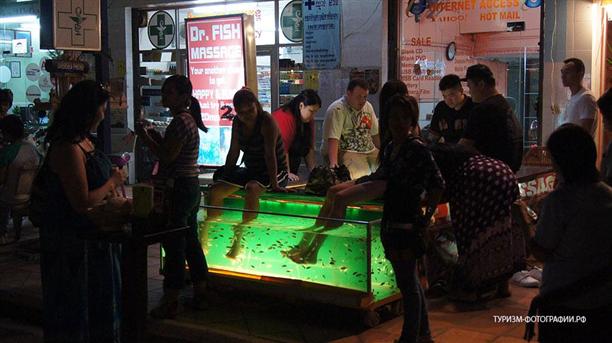 Массаж рыбками, если нет клиентов, то туже устраивается акция: массаж + банка пива и за всё, в переводе на рубли, 60 рублей!