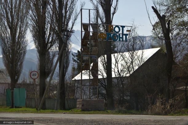 Приветственные щиты на въезде в город. Видел такое же и в Алма-Ате. В советское время город назывался Фрунзе в честь революционера, родившегося здесь.