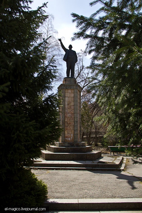 Перед самим санаторием несколько жилых домов. Обратите внимание на размер трубы за домиком справа
