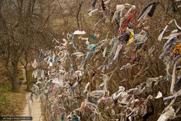 Как в любом месте, где есть что-то священное, привязываются тряпки. Только они раскрашивали голые весенние деревья