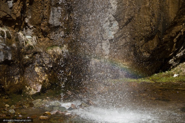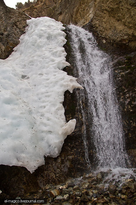 Водопад в ущелье Иссык-Ата. Голубоватый лед еще не успел растаять, несмотря на то что были уже первые числа апреля. В это ущелье практически не попадает солнце, поэтому лед здесь можно будет встретить еще и летом
