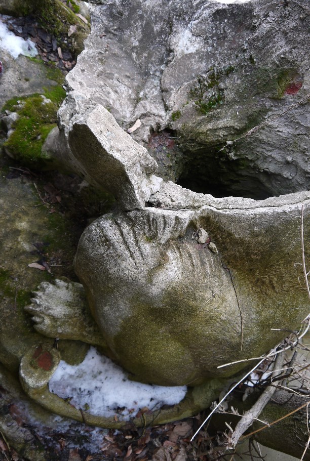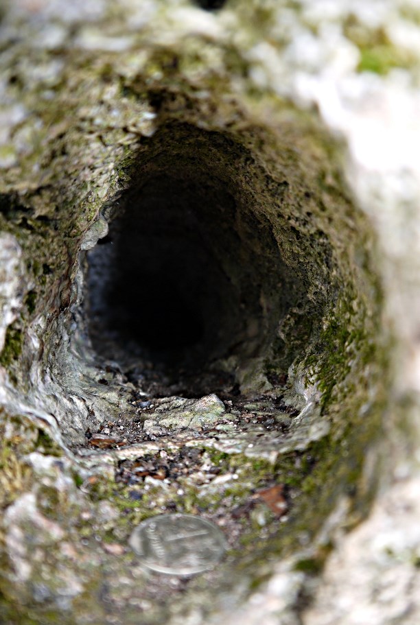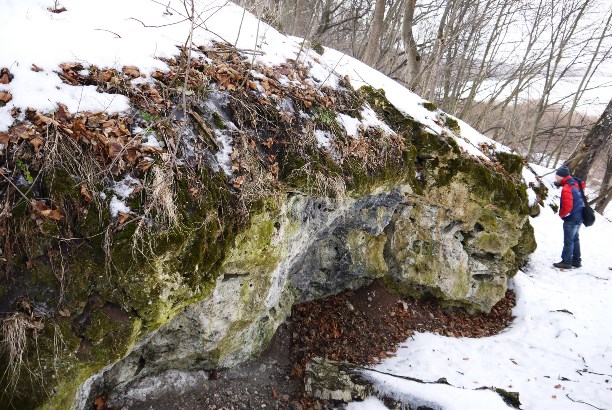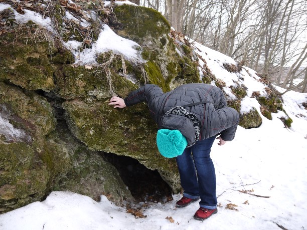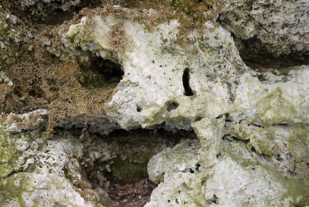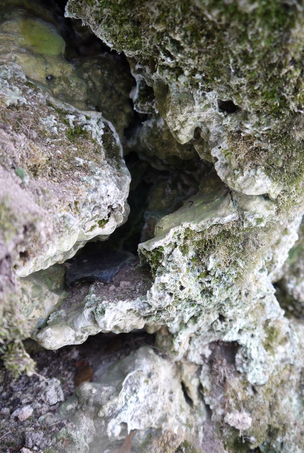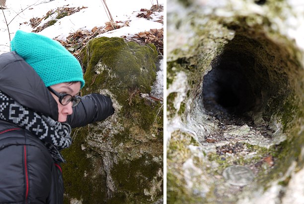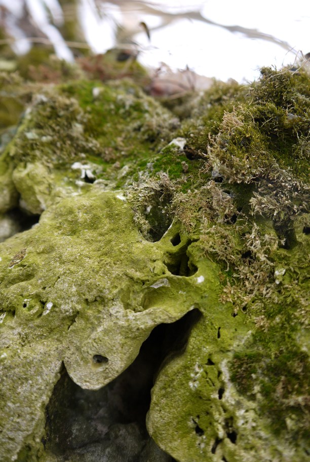 Недалеко от усадьбы - карстовый разлом (не большой, но очень живописный). К нему можно прийти по тем же синим стрелкам, если от усадьбы вернуться на тропинку у реки. А там всё, как надо, - каменные морды, непонятные норы, разноцветные мхи и яркие лишайники.