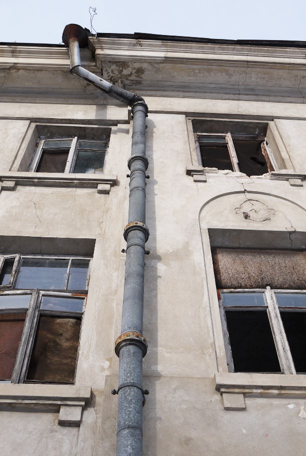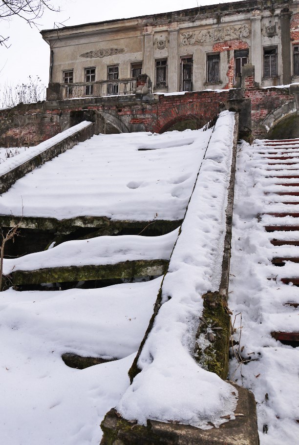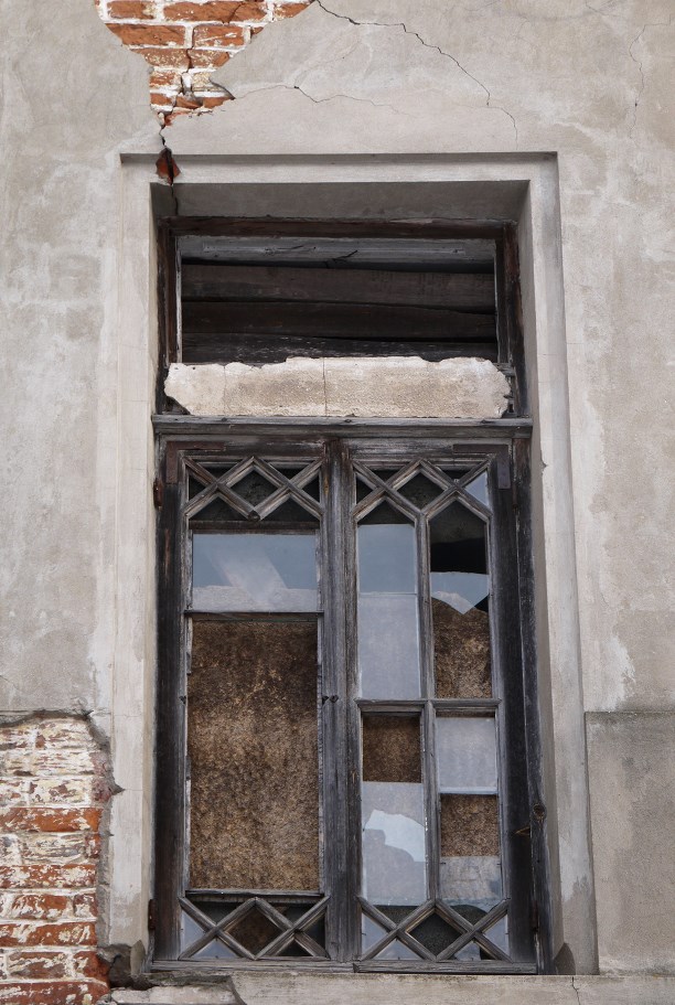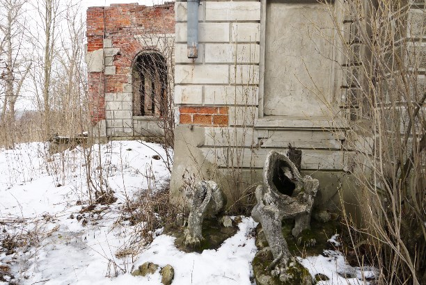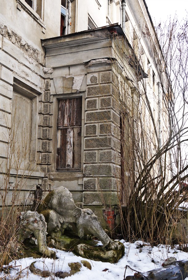 Дубовый паркет и винтовые лестницы, бронзовые ручки в виде орлиной лапы с зажатым в ней искусственным рубином, изразцовые печи - всё это ушло в прошлое. Внутрь дома, чтобы проверить сей факт наверняка, нам попасть не удалось. Двери и окна первого этажа наглухо заколочены. Входом является окно второго этажа над крыльцом, если верить паркуристам.
