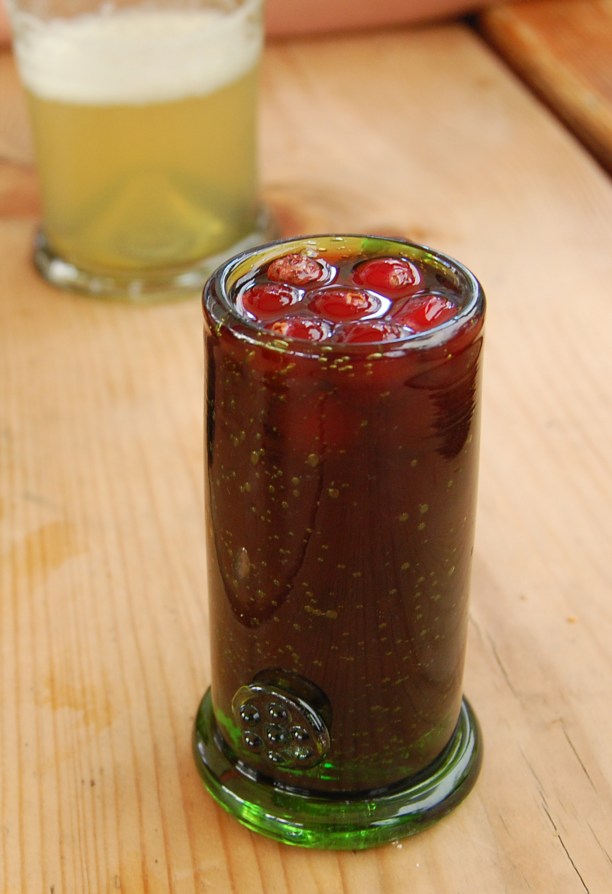 когда принимают заказ. Вместо приборов нам принесли деревянные «вилки». И подали очень вкусное пиво с корицей и шнапс на смородине.
