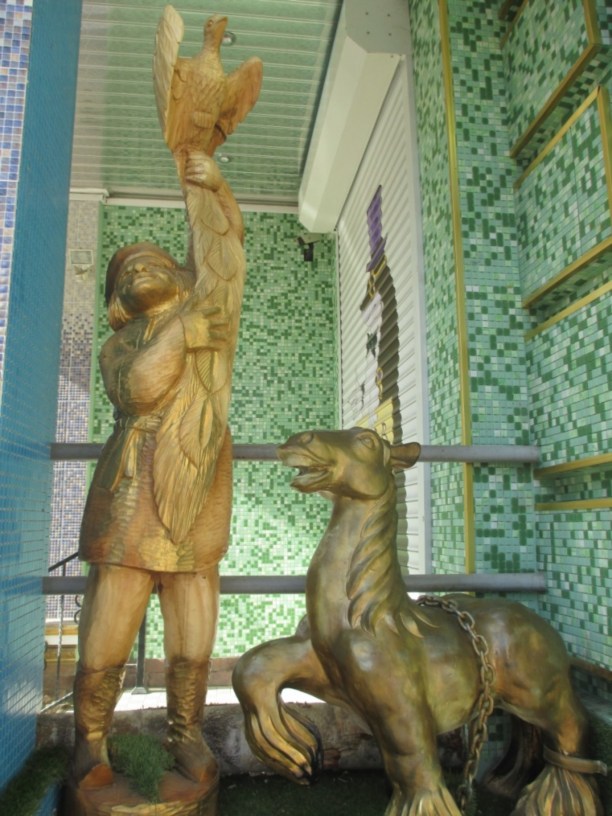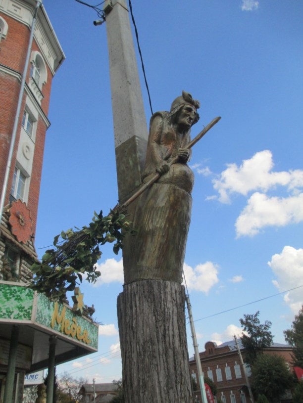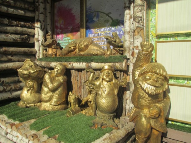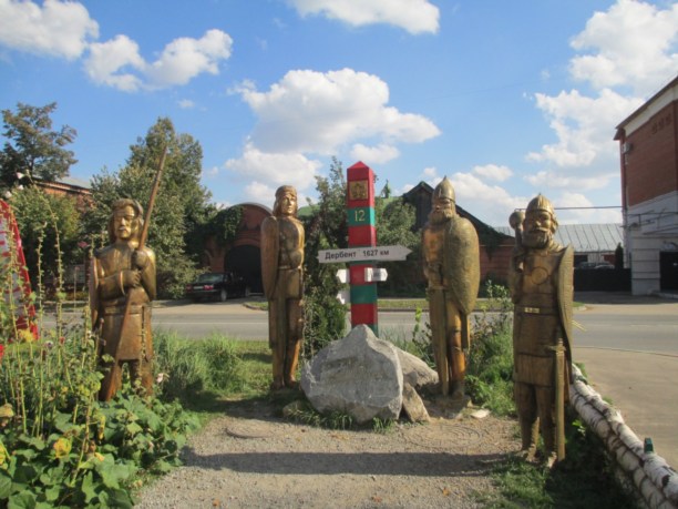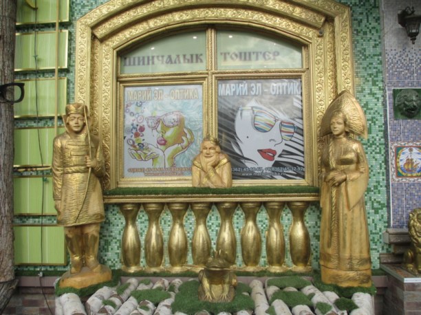 Так же рядом с магазином вы можете увидеть, четвёрку богатырей (наши родные Святогор и Илья Муромец, а так же марийские Онар и Чоткар) зорко охраняющих верстовой столб, указывающий расстояния до разных частей нашей необъятной Родины,