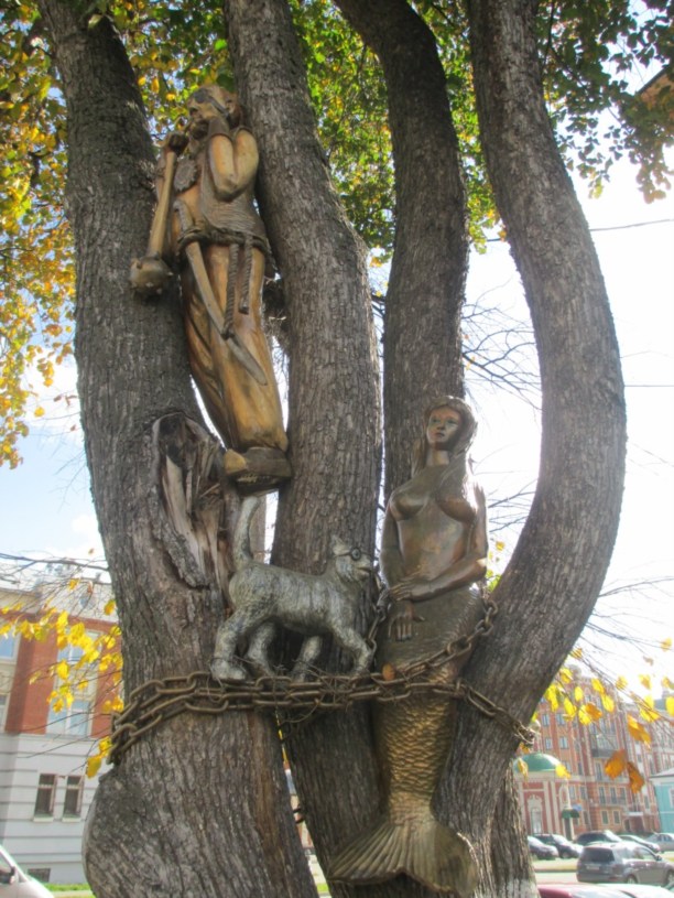 и дерево, в ветвях которого притаился Соловей Разбойник, компанию которому составляют Русалка и Кот Учёный: