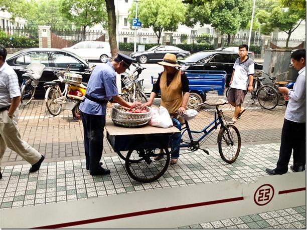 На фоне этой потрясающей инфраструктуры бросается в глаза нищета местного населения. Эта сценка на улице Шанхая показывает, как охранник банка покупает помидоры у уличного торговца. Хотя можно увидеть как из канализационного люка высунется сантехник достанет iPhone и начнет куда-то звонить.