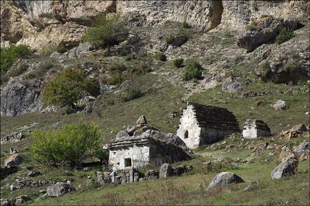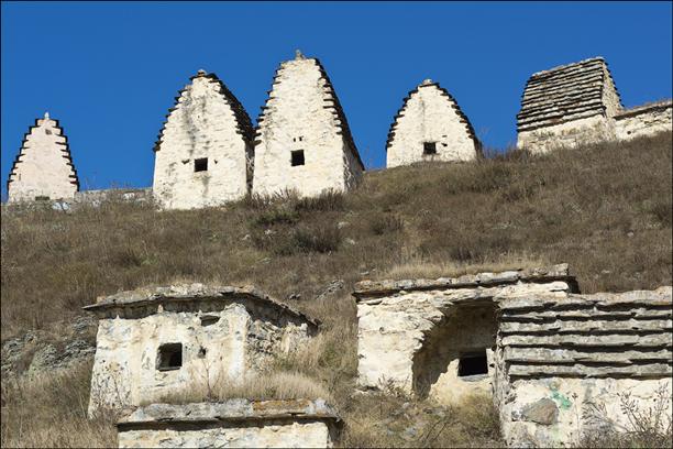 Домики-усыпальницы древних алан и их потомков иногда сравнивают с Долиной фараонов в Египте. Но чаще, благодаря схожей архитектуре, в склепах находят сходство с башнями средневековых храмов Ангкора в Камбодже. Одни склепы располагаются над землёй, и их крыша представляет собой ступенчатую пирамиду, собранную из сланцевой плитки. Есть похожие склепы, но увенчанные двухскатным перекрытием. А есть совсем простые прямоугольные камеры, сложенные из больших, грубо обработанных каменных плит. Чем богаче и больше была семья — тем сложнее и больше строила она себе «домик». В центре фасадной стены склепов есть небольшое окошко — лаз, через который вносили умерших и укладывали на настил. Потом окно закрывали деревянным щитом с задвижкой. Сейчас дверок нет и все желающие могут заглянуть внутрь. Если не страшно. Потому что зрелище не для слабонервных — внутри на деревянном настиле лежат кости, черепа, обрывки одежды. Да и запах витает не самый ароматный…