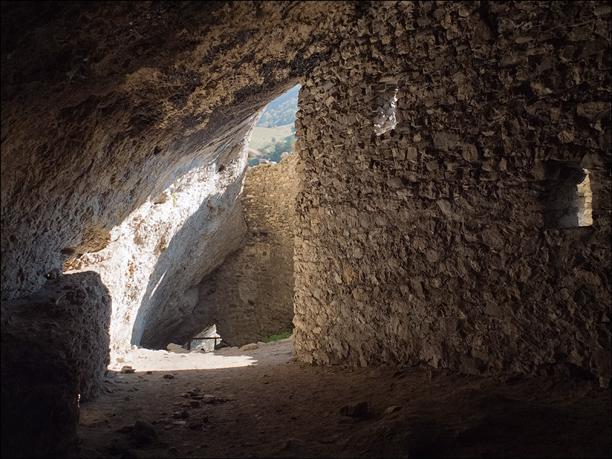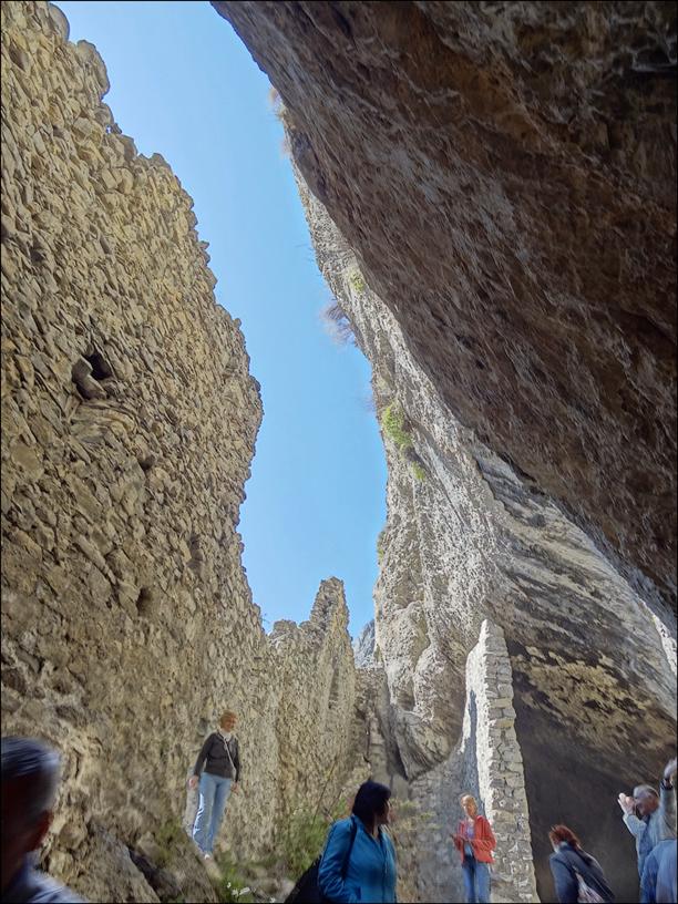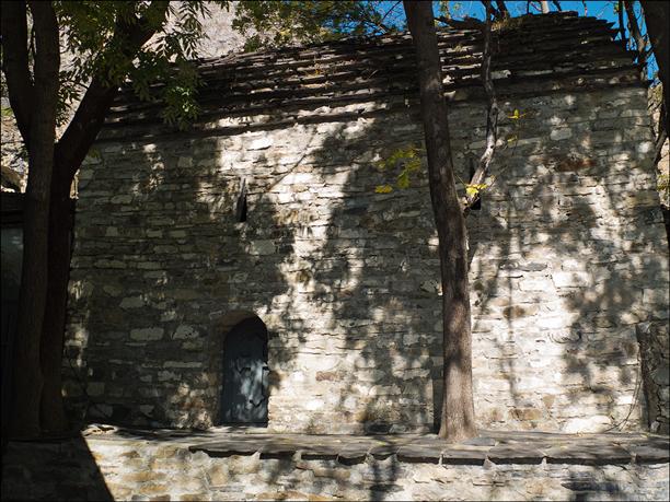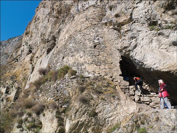 Следующая остановка ждала нас у селения Дзивгис, где можно увидеть колоритные осетинские склепы, рядом с ними святилище и церковь, а чуть в стороне ещё и крупнейшую на Северном Кавказе наскальную крепость. Её ещё надо постараться увидеть — настолько она сливается со скалами. Кстати, Интернет говорит, что немного выше от указанных склепов находятся пещеры, а при дальнейшем восхождении по склону можно выйти в боковое ущелье, где есть заброшенное селение Фаскау, от которого можно проделать кольцевой маршрут обратно в Кадаргаван — но это уже зарубка на неопределённое будущее… А нас, конечно же, первым делом повели в святилище. Расположенная рядом с ним древняя церковь закрыта и открывается только по большим праздникам, но экскурсовод показала дырочку-окошко, сквозь которую Лена умудрилась сфотографировать тёмные недра храма.