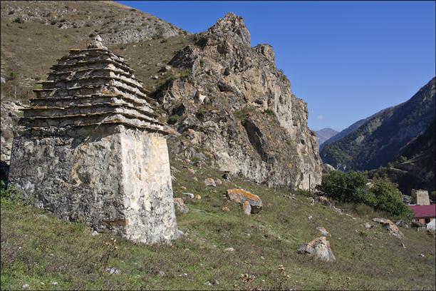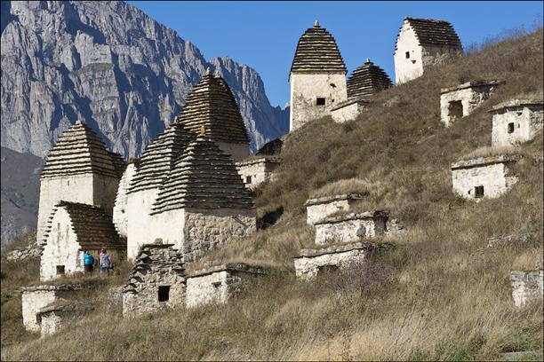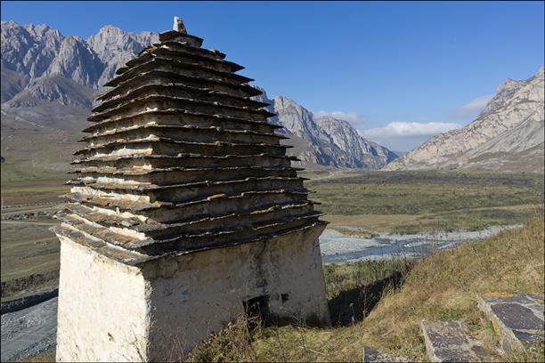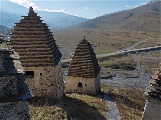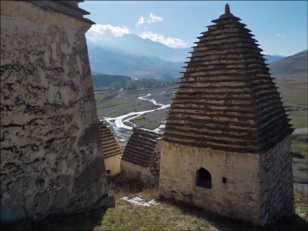 Некрополь у селения Даргавс — самый крупный из подобных захоронений на Северном Кавказе. Он состоит из 95 склепов. Каждый из них является общей усыпальницей для немалого количества поколений осетин-однофамильцев. Число склепов напрямую зависит от численности населения. В прошлом Даргавс считался одним из наиболее крупных населенных пунктов Осетии, а сейчас тут осталось около десятка домов. Селение расположилось на берегу реки Гизельдон в самом центре горной котловины, которая тысячи лет назад возникла под воздействием талых вод окрестных ледников. Со всех сторон долина защищена горами от облачных фронтов и ветров, плюс — это одно из самых солнечных мест в республике, почти весь год тут стоит ясная погода. И благодаря этому тут сложился особый микроклимат — даже осенью и зимой в этих местах сухо. На южной стороне ущелья возвышается ледяная вершина горы Джимарай-Хох. С её ледников постоянно дует прохладный ветер. Внизу бежит речка Гизельдон — пейзаж с горы Раминырах, на которой находится некрополь, открывается очень красивый.