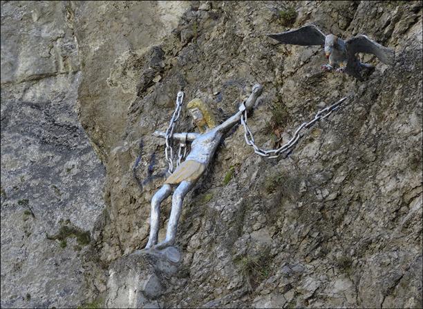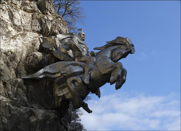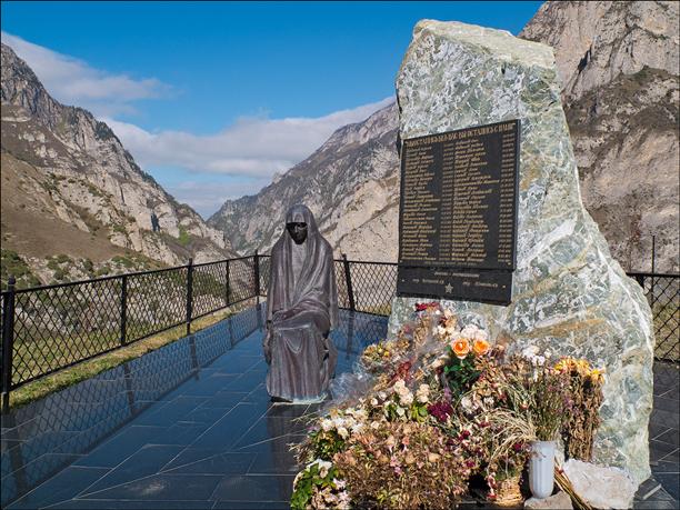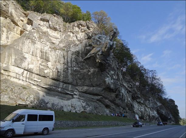 Но оказалось, это только начало череды разочарований — нас повезли в Алагирское ущелье. У самого его начала путников встречает гигантский Уастырджи, который ассоциируется у осетин со святым Георгием. Он как будто вылетает из скалы над дорогой. Монумент, конечно, внушительный, но не столь поражающий воображение, чтобы только ради него делать такой крюк от основного маршрута. Впрочем, как потом выяснилось, что не такой уж он и основной, а сплошь состоит из дополнений за отдельную плату. Похоже, в стоимость экскурсии входила только доставка в Осетию, а каждый шаг к чему-нибудь действительно интересному стоит дополнительных денег. В общем, как вы, наверное, догадались, никаких живописных теснин нам не показали — знакомство с Алагирским ущельем ограничилось встречей с Уастырджи…