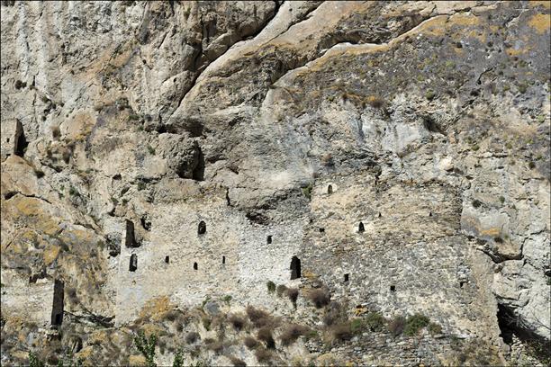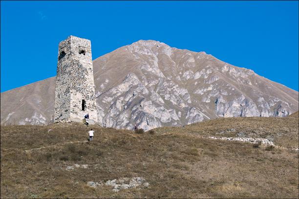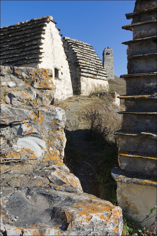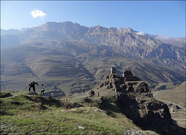 Святилище, в отличие от храма, открыто всегда — и длинные столы с буфетом полным стаканов красноречиво говорят о душе осетинского народа. Никакое это не язычество, просто этот народ любит праздник, любит собираться и общаться за одним столом. Это же прекрасно, когда соседи могут собраться вот так все вместе и выпить за общим столом чарку-другую вина. У нас этот обычай уже почти совсем умер, а здесь живёт! Вспоминается, как когда-то во время повышения квалификации в Москве именно коллега из Владикавказа сумел организовать в гостинице праздник, нашёл в столице самые вкусные осетинские пироги и накормил ими человек двадцать своих сослуживцев, которых он до этого и в глаза не видел! Поэтому было очень обидно слушать ироничные комментарии нашей сопровождающей, и мы старались сбежать от неё подальше — лучше спокойно без толпы побродить около живописных склепов. Правда, без неё мы могли бы и не заметить крепость — тут действительно нужен человек, который показал бы на неё пальцем. Правда, по её словам средневековых защитников цитадели это не спасло — войска Тимура они остановить не смогли…