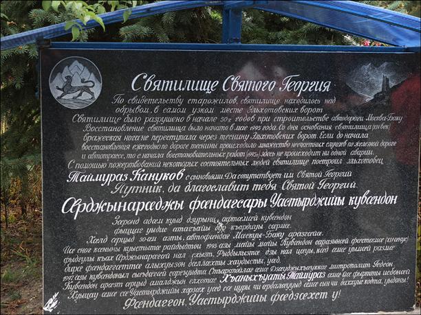 Покинув Ставропольский край, мы пересекли Кабардино-Балкарию и, миновав знаменитый Терек, оказались в Северной Осетии. Здесь, у начала Военно-Осетинской дороги, в районе Эльхотовских Ворот нас ждала первая остановка, с которой и началась бесконечная лекция о религиозных предпочтениях осетин, затянувшаяся на весь день. То ли нашу сопровождающую веселило, то ли, наоборот, злило то, что из всего христианского пантеона осетины выбрали себе в покровители Георгия Победоносца, но тема брутального всадника на трёхногом коне прошла в итоге красной нитью через всё наше путешествие. Нам пришлось знакомиться с Аланией со слов человека, который позволял себе выражать своё мнение в формулировках типа: «До них не дошёл свет христианства, они погрязли в своём язычестве». Даже не беря этическую сторону (а кто из нас не язычник, кстати?), это было, по крайней мере, не профессионально…