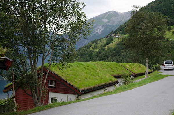 Ещё дома Оля решила, что в Гейрангере мы должны идти по дороге Троллей к водопаду над посёлком. Вперёд и вверх! По пути увидели вот такие дома с традиционными северными крышами покрытыми дёрном. Вода не просачивается.
