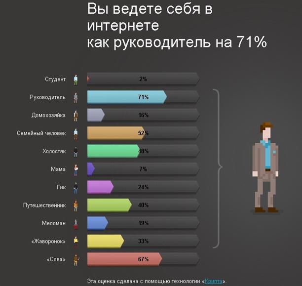 Скажи мне, кто твой друг, и я скажу тебе, кто ты. Ха! Методика определения "по друзьям" - каменный век по сравнению с вашей историей поисковых запросов. Поиск знает о вас больше чем священник, больше чем родная мать. То, в чем мы исповедуемся поисковой строке, возможно, не расскажем даже личному психоаналитику.