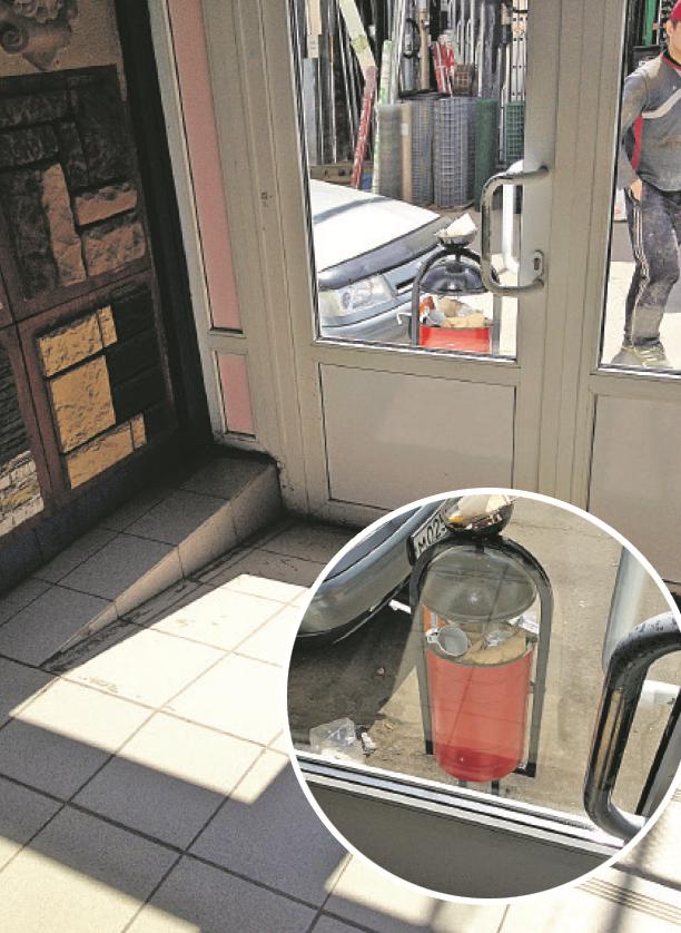 «Доступная среда по-тульски». За пандусом для инвалидов и колясок – дверь. За дверью – забетонированная урна. (ТЦ на Фрунзенской ярмарке. Фото Юлии Карасёвой).