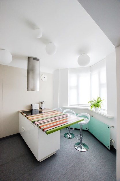 На кухне установили остров, а точнее, полуостров. Такой вариант для Иры удобнее, чем мебель, выстроенная в линию или уголком. Двигаться недалеко –всего-то между ним и линией кухни возле стены. Полуостров также послужит обеденным столом. Высокие барные стулья тоже должны быть удобны для Иры.