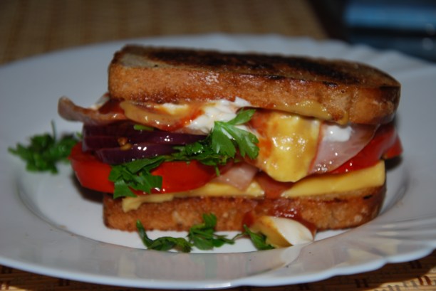 , бекон и грудинку в нарезке (самые дешевые), помидоры, лук репчатый и петрушку с дачной грядки, майонез, кетчуп, горчицу. Моем-режем овощи (помидоры-лук - кольцами), обжариваем чуть-чуть на большом огне, откладываем в сторону. Обжариваем беконо-грудинку, откладываем в сторону. Хлеб обжариваем на среднем огне, дабы не спалить. Обжарили с одной стороны, переворачиваем, пока он румянится с другой, начинаем "колдовать": один кусок мажем кетчупо-гарчице-майонезом, сверху кладем мясные составляющие. На другой кусок кладем сыр, сверху лук-помидоры и петрушку. Как хлеб поджарился, а сыр чуть-чуть растаял, снимаем это все на тарелку и аккуратно, чтобы не развалился этот разорвилицобутерброд соединяем. Приятного аппетита!
