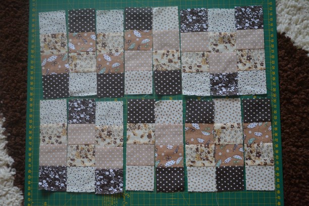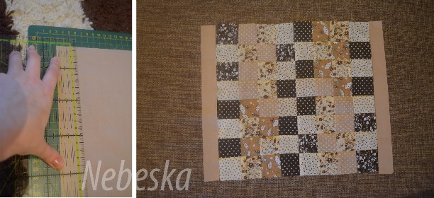 Из маленьких заготовок мы должны собрать полотно 8 х 8. В нашем случае оно не большого размера и его можно собирать прямо на столе.