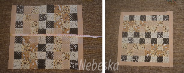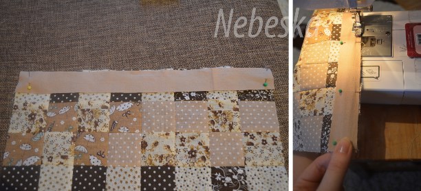 На данном этапе можно исправить огрехи раскроя и сшивания. Если вдруг квадраты немного не совпадают, правильно совмещая стыки, мы можем немного натянуть или отпустить ткань. Когда мы будем сшивать полосу, нужно немного натянуть ее на себя, чтобы провис или натяжение ткани прострочились так, как надо. Но этим лучше не злоупотреблять. Если вы не планируете стегать изделие ( а наволочку стегать мы не будем), в случае сильного перетягивания ткани, полотно будет идти волной, что его не украсит.