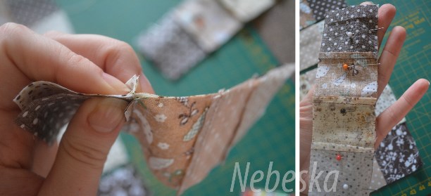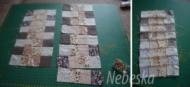 Начинаем сшивать полосы. Действуем по принципу из пунктов 2, 3, 4, начиная с верхнего ряда. Сначала верхние 8 полосочек, затем нижние. Единственное, что нужно делать, аккуратно и внимательно совмещать стыки между квадратами разных полосок. Скалывать начинаем именно с них. Совмещаем первый стык, вставляем булавку. Совмещаем второй, вкалываем булавку. Последними закрепляются начало и конец полосы.