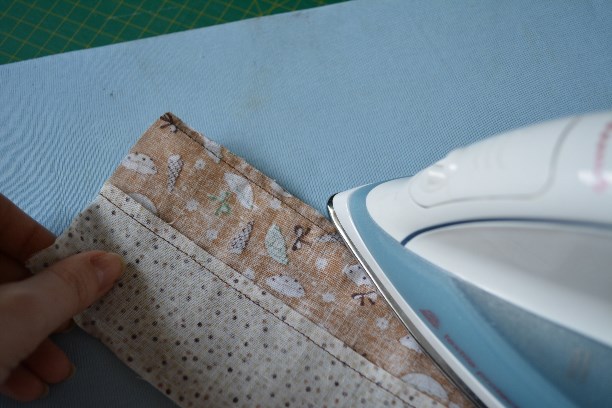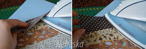 Теперь необходимо заутюжить срез на одну из сторон. Принято утюжить на более темную: так не будет видно шва с лицевой стороны. Как это делается: светлой лицевой стороной кладем к себе, темную полоску держим в руке, немного подгибая на себя. Теперь проводим утюгом от себя, загибая темную сторону. Делаем это без сильного нажима, простым движением (я еще сразу отпариваю, чтобы закрепить результат). Темную полоску не тянем, просто придерживаем.