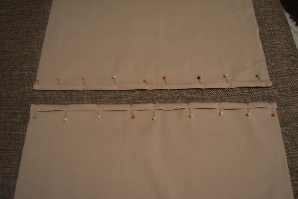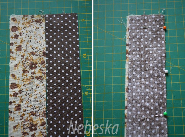 Берем 2 полосочки, соединяем по одному краю и прокалываем булавками перпендикулярно срезу(!) с шагом, который комфортен вам в работе - в этом случае, при прошивании, мы не сломаем иголку в машине.