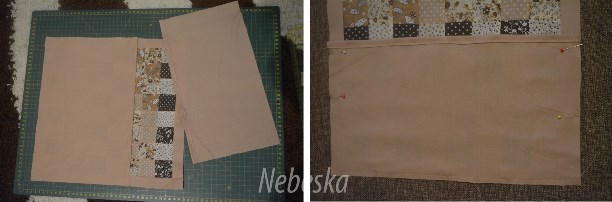 Теперь необходимо сделать задник. Вырезаем из ткани прямоугольник с шириной нашего полотна и длиной полотно + запас для клапана кармана (около 15 см). Разрезаем полученный прямоугольник в пропорции 2\3. Это будут две половинки задника.