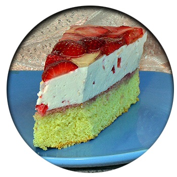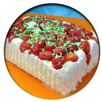 - Приготовить желе из пакетика. Нарезать клубнику пластинами. Клубнику выложить по кругу на творожный крем, налить сверху небольшой слой желе. Поставить в холодильник минут на 15, как застынет, налить ещё желе и убрать в холодильник до полного застывания (лучше на ночь).