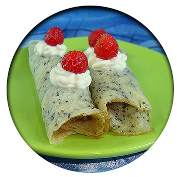 На 12 блинчиков: 2 стакана молока, 20 г сливочного масла, 10 г ванильного сахара, 2 ст. ложки мака, 2 желтка, 1/3 ч. ложки соли, 1 стакан муки. Для начинки: земляничное (клубничное) варенье.
