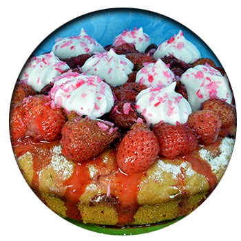 - Выложить ягоды на пирог и оставить на 30 минут. Украсить взбитыми сливками и посыпать сахарной пудрой.