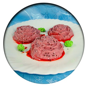 - Для приготовления соуса клубничный сок немного уварить с небольшим количеством сахара. Для украшения немного соуса вылить на тарелку. Затем на него выложить мусс. Или другой вариант – тарелку украсить капельками сока, а мусс – кондитерской посыпкой.