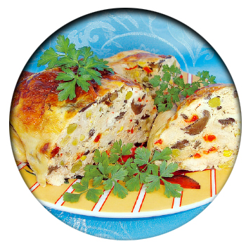 - Болгарский перец, лук и грибы нарезать кубиками. Лук и грибы – обжарить. Мясо, снятое с окорочков, пропустить через мясорубку, а мясо, снятое с курицы – нарезать средними кусочками и замариновать в сливках, молотом перце, пряностях, посолить.