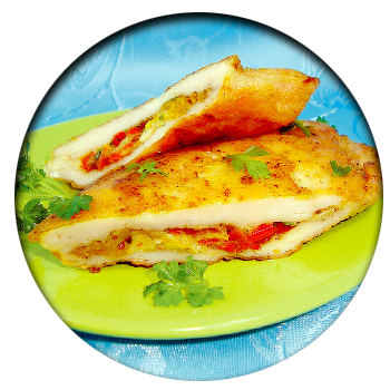 - Начинка: порезать полукольцами лук, красный болгарский перец, натереть на средней тёрке морковь и обжарить на растительном масле, в конце добавить мелко нарезанный чеснок. Выложить в миску,добавить тертый сыр, порезанную зелень, помешать. На одну половинку отбитого филе выложить начинку и накрыть другой половиной. Прижать руками. Панировать в муке, во взбитом яйце. Жарить на разогретой с растительным маслом сковороде на среднем огне под крышкой с двух сторон до готовности. Подать с любым гарниром.