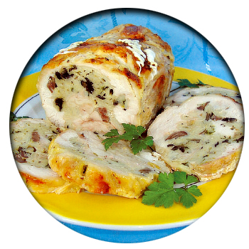 - На куриный пласт разложить начинку. На серединку положить кусочек сливочного масла. Свернуть рулет. Обвязать толстой нитью или сколоть деревянными шпажками. Положить в пакет для запекания. Скрепить концы рукава для запекания. Выложить на противень и поставить в разогретую духовку.