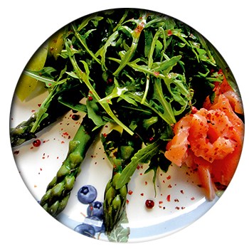 Сёмга с/с, спаржа зелёная, руккола, зелёное яблоко, маслины, сок лимона, оливковое масло, соль, перец, розовый перец горошком.