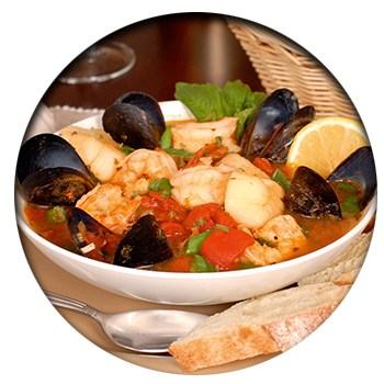 - На тарелку выложить мидии и треску, добавить гребешки и креветки, щедро залить все томатным бульоном, посыпать рубленым чесноком и петрушкой. Подавать с чесночными гренками.