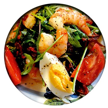 Пармезан, креветки (варёные, очищенные), яйца варёные, томаты вяленые в масле, лук красный, томаты черри, руккола.