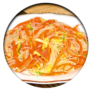 Морковь по-корейски 200 г, фунчоза 1/3 пачки, огурец свежий 2 шт., капуста свежая 1/2 небольшого кочана, уксус рисовый, масло кунжутное, соевый соус, сахар, соль.