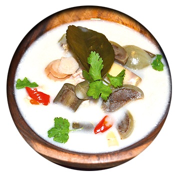 Куриный бульон 500 мл, кокосовое молоко 200 мл, куриная грудка 1/2, шампиньоны 7 шт., креветки 7 шт., лемонграсс 1 свежий стебель или 1 ст. л. сухого, имбирь свежий 4 см, галангал 1 ст. л., листья каффрского лайма 3 шт., перец чили 1 шт., помидор 1 шт., сахар 1 ст. л., соевый соус 1 ст. л., рыбный соус 2 ст. л., сок лайма, кинза, соль.